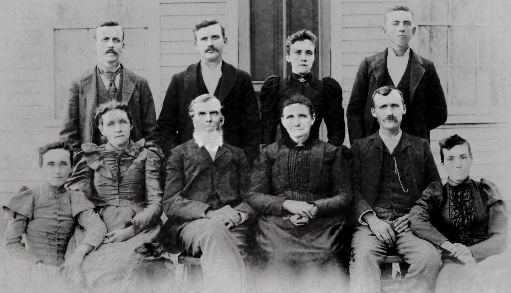 Robert and Jannet Cathcart, surrounded by their adult children, in Winchester, Kansas in 1895.